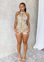 Sleeveless zipper top, and trendy short suit with belt. High-quality fabric, Thick material